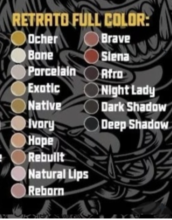 Colores Set: ocher , bone , porcelain , exotic ,native , ivory, hope, rebullt, natural lips, reborn, brave, siena, afro, night lady, dark shadow, deep shadow.